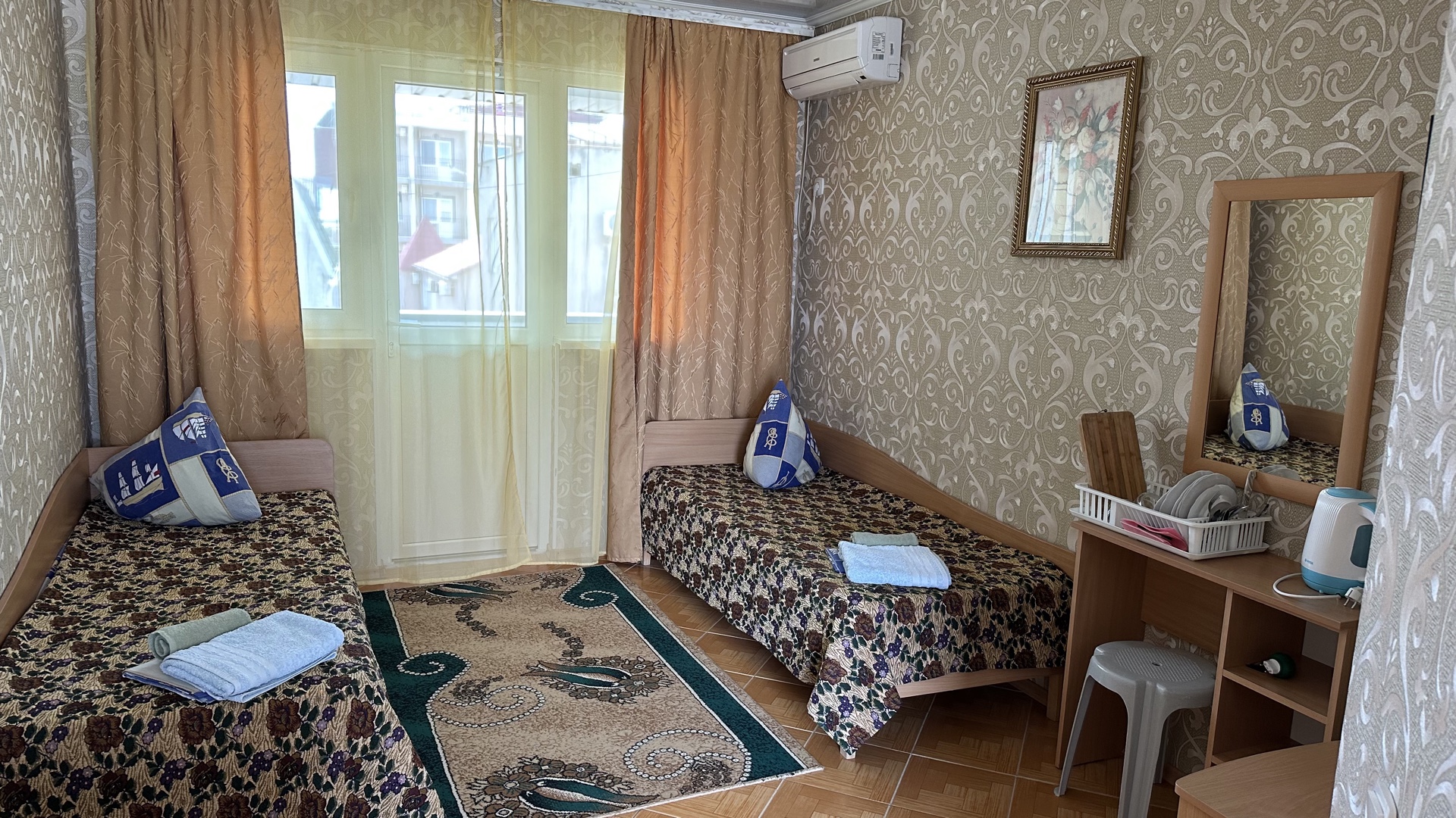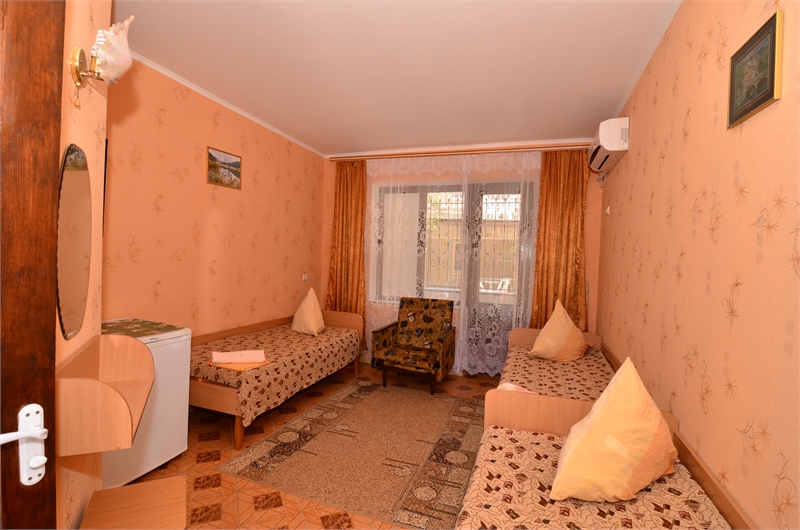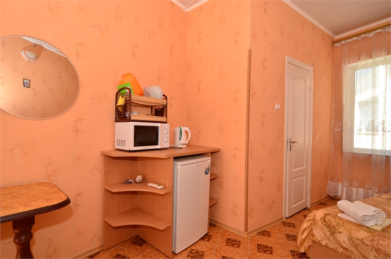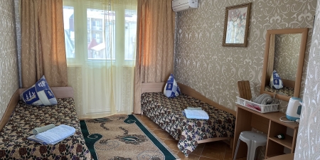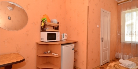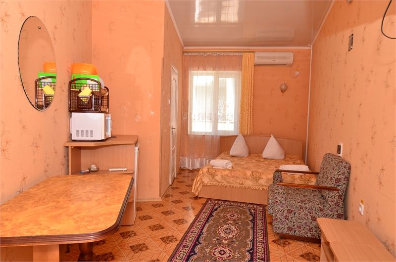 В 2-местном номере, площадь которого 16 кв.м., имеется необходимая мебель (двуспальная кровать, шифоньер, зеркало, стулья, стол), кондиционер, холодильник, телевизор, микроволновая печь, электрочайник, посуда, москитные сетки, утюг, гладильная доска, фумигатор, совмещенный санузел. Горячая вода подается круглосуточно.