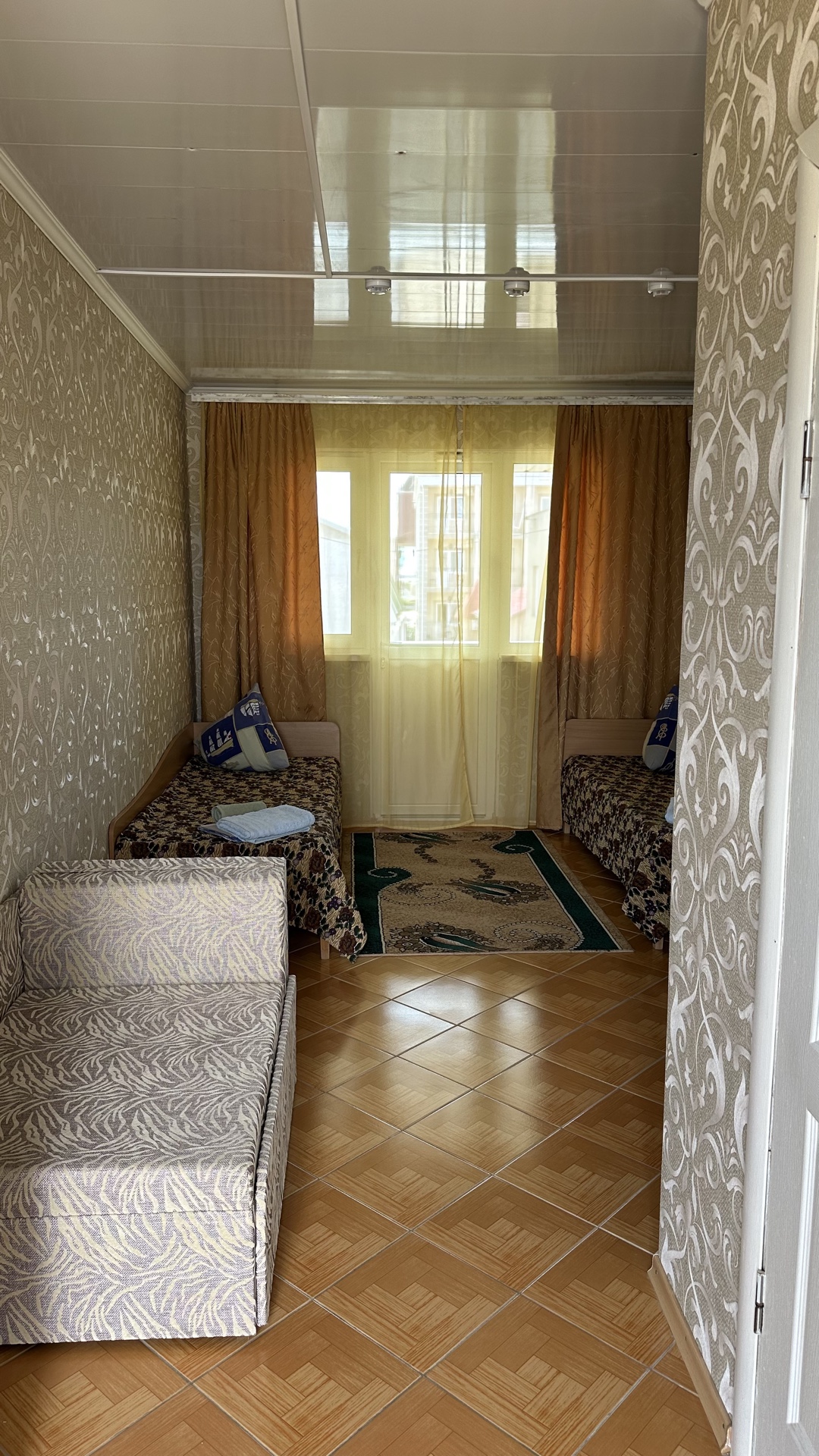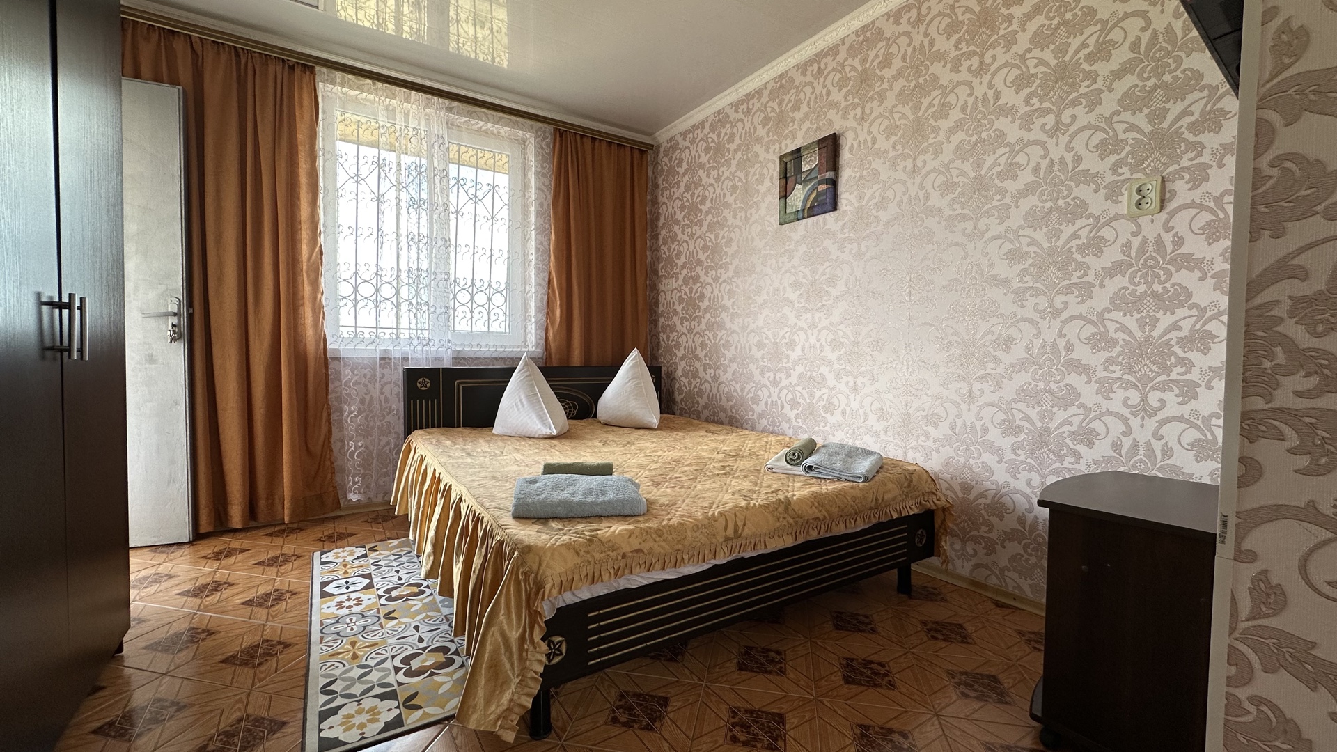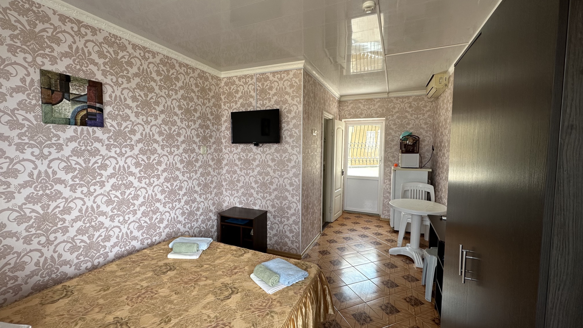 В 2-местном номере, площадь которого 16 кв.м., имеется необходимая мебель (двуспальная кровать, шифоньер, зеркало, стулья, стол), кондиционер, холодильник, телевизор, микроволновая печь, электрочайник, посуда, москитные сетки, утюг, гладильная доска, фумигатор, совмещенный санузел. Горячая вода подается круглосуточно.