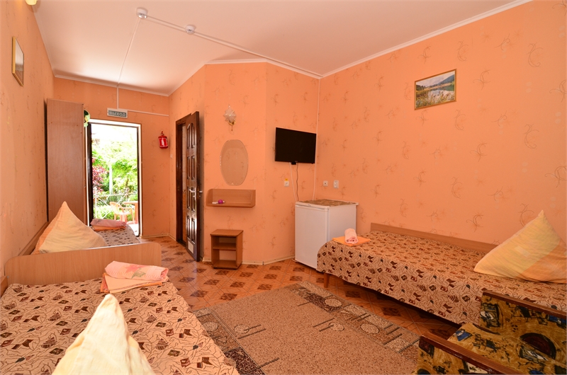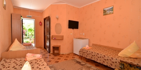 Коттедж "ОЛЬГА" . Просторные и светлые номера с лоджиями рассчитаны на три взрослых персоны. Номера, площадью 21 кв.м, в том числе площадь санузла 3 кв.м, а лоджии - 6,3 кв.м, укомплектованы холодильником, СВЧ-печью, телевизором, электрочайником, столом, стульями, табуреткой, фумигатором, махровыми полотенцами, туалетной бумагой, зеркалом, вешалкой, пластиковым тазом.